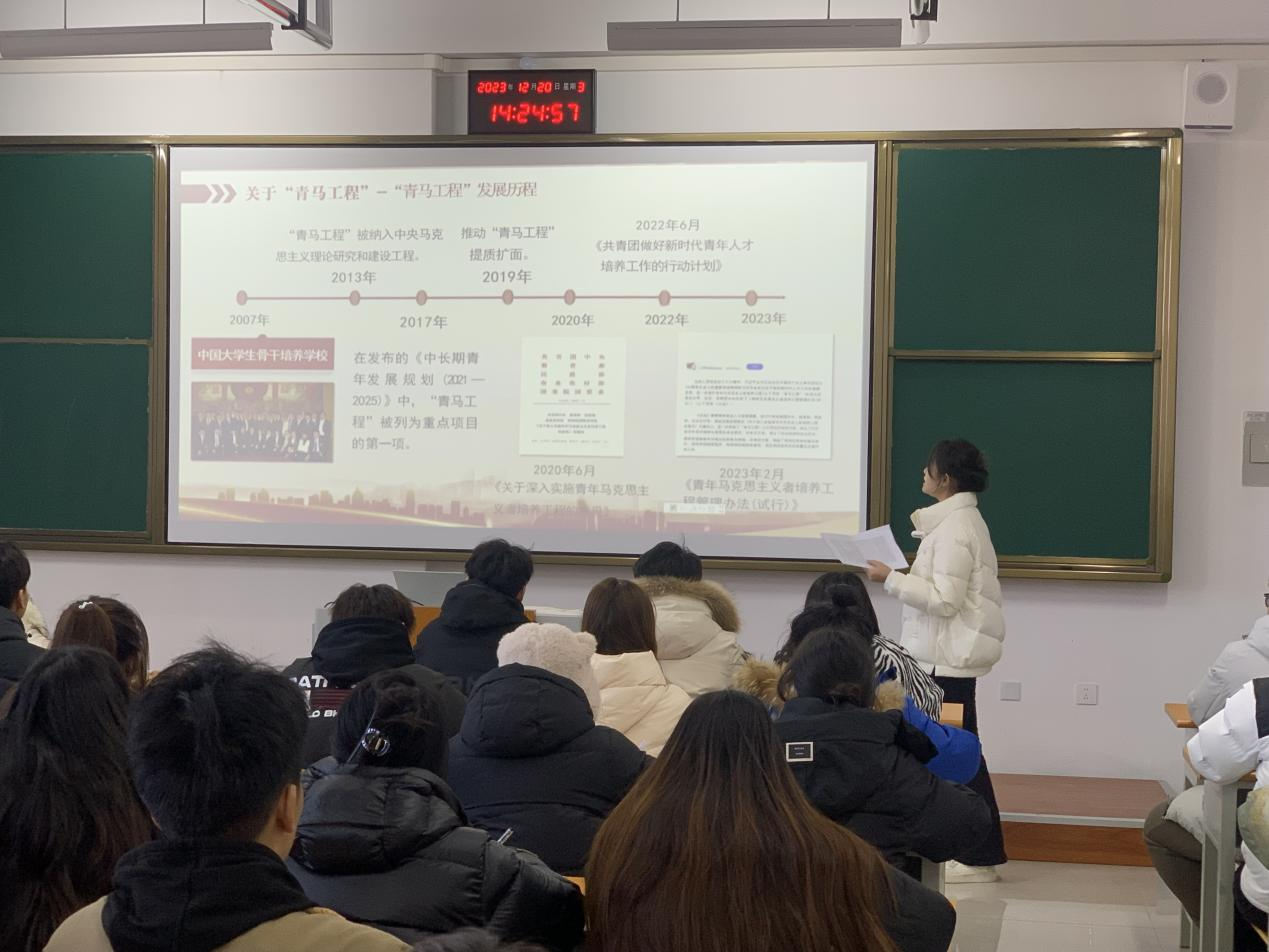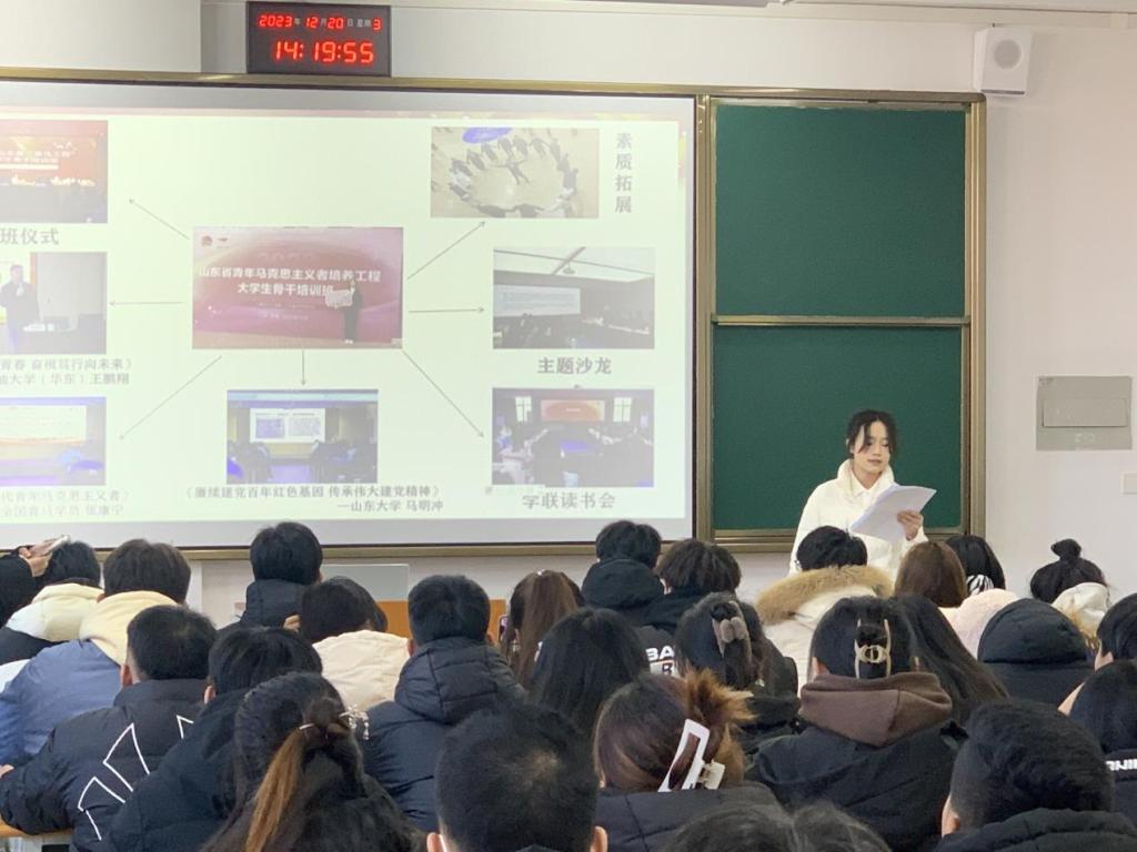 12月20日下午,山東化工職業(yè)學(xué)院青馬大講堂——2023年山東省青年馬克思主義者培養(yǎng)工程學(xué)習(xí)分享會在4315教室舉辦。山東省青年馬克思主義者培養(yǎng)工程班學(xué)員董素連以“點(diǎn)亮一盞燈 照亮一大片”為題作分享。會議以線上、線下形式開展,全體學(xué)員參加。