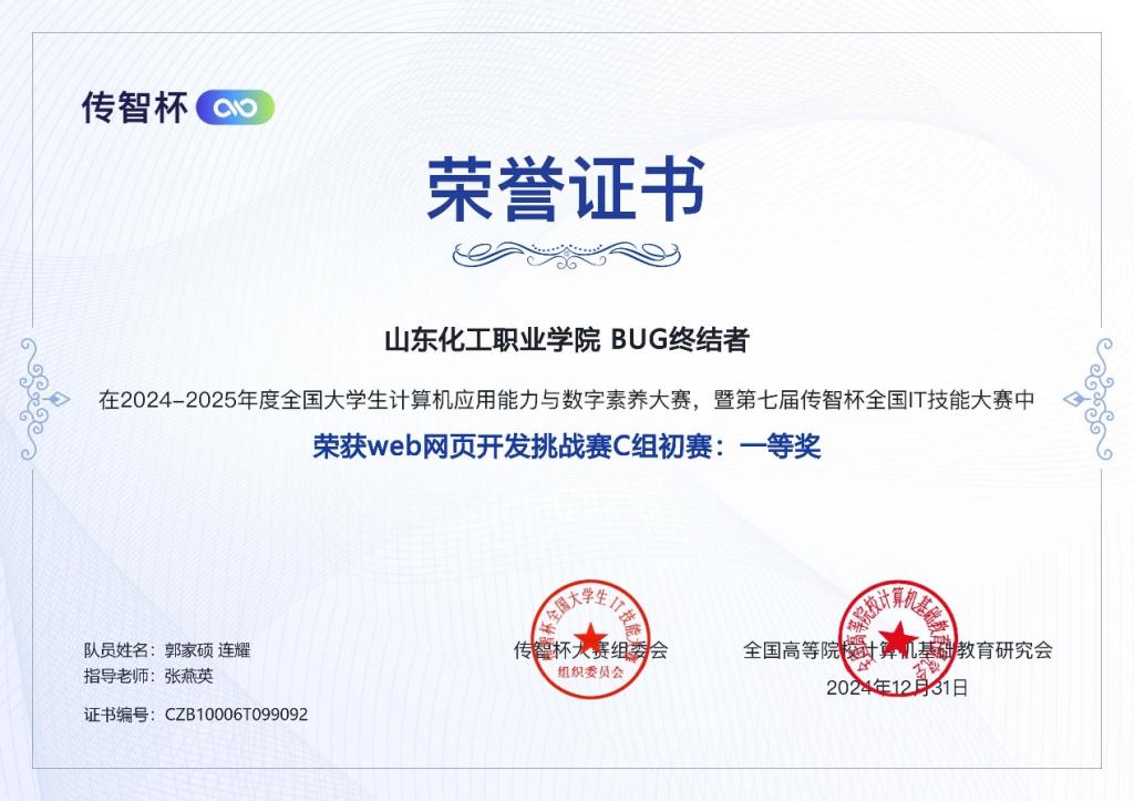 第七屆傳智杯全國IT技能大賽“未來創(chuàng)想,網(wǎng)啟新篇”網(wǎng)頁設(shè)計挑戰(zhàn)賽省賽圓滿結(jié)束。經(jīng)過激烈角逐,我校學(xué)生連耀、郭家碩取得初賽一等獎和省賽二等獎的優(yōu)異成績,教師張燕英榮獲“優(yōu)秀指導(dǎo)教師”。