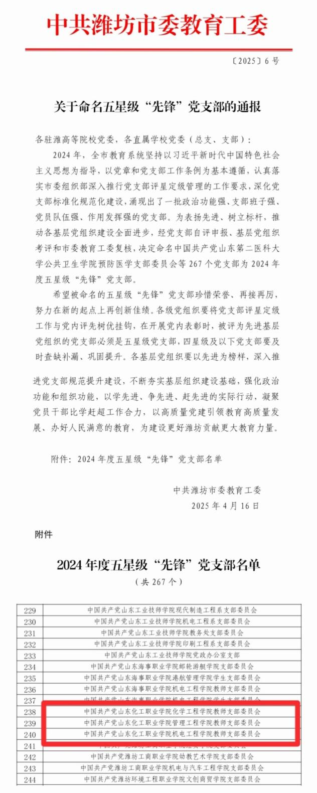 近日,濰坊市委教育工委發(fā)布《關(guān)于命名五星級(jí)“先鋒”黨支部的通報(bào)》,我?;瘜W(xué)工程學(xué)院教師黨支部、管理工程學(xué)院教師黨支部、機(jī)電工程學(xué)院教師黨支部三個(gè)支部被評(píng)為五星級(jí)“先鋒”黨支部。
