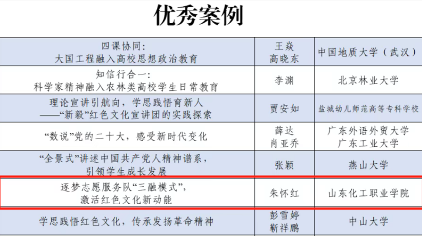 近日,教育部高校思想政治工作隊(duì)伍培訓(xùn)研修中心(山東大學(xué))、《高校輔導(dǎo)員》編輯部公布了2024年高校思想政治工作優(yōu)秀文章征集活動(dòng)的評選結(jié)果。我校教師朱懷紅的《逐夢志愿服務(wù)隊(duì)“三融模式”,激活紅色文化新動(dòng)能》成功入選優(yōu)秀案例,展現(xiàn)了卓越的思想政治工作創(chuàng)新成果。
