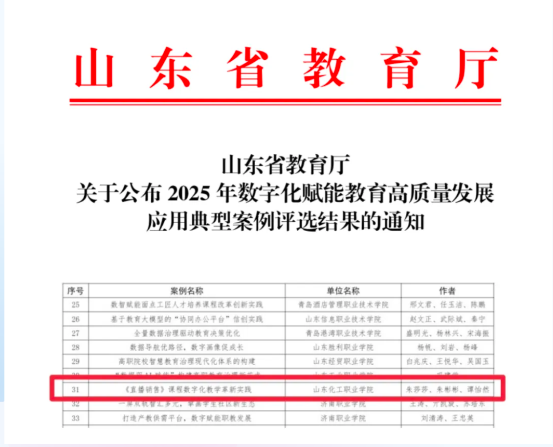 近日,山東省教育廳公布了2025年數(shù)字化賦能教育高質(zhì)量發(fā)展應(yīng)用典型案例評選結(jié)果,我校申報的“《直播銷售》課程數(shù)字化教學(xué)革新實踐”典型案例成功入選。據(jù)悉,此次全省高等職業(yè)院校共評選出典型案例55項。