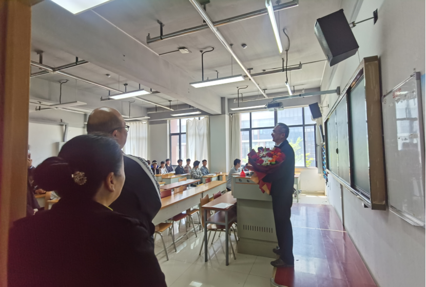 4月27日上午,三號教學(xué)樓3202教室,隨著下課鈴聲的響起,李欽唐老師結(jié)束了教學(xué)生涯中的最后一節(jié)課,機(jī)電工程學(xué)院領(lǐng)導(dǎo)班子和教師代表走進(jìn)教室,與學(xué)生一起為李欽唐老師送上了鮮花和祝福,表達(dá)了機(jī)電工程學(xué)院全體師生對李老師辛勤耕耘教壇40余年工作的感謝和依依惜別之情。