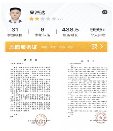 吳浩達(dá)連續(xù)兩年參加青鳥(niǎo)計(jì)劃,2025年2月,獲評(píng)臨沂市蘭山區(qū)“十佳青鳥(niǎo)學(xué)子”榮譽(yù)稱號(hào);其創(chuàng)作日常工作Vlog視頻被共青團(tuán)臨沂市蘭山區(qū)委視頻號(hào)投放,瀏覽量過(guò)萬(wàn)。作為項(xiàng)目組織者的他,還組織策劃了2025年臨沂市蘭山區(qū)青年春節(jié)聯(lián)歡晚會(huì)。