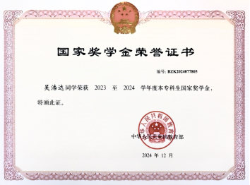 在校學(xué)習(xí)期間,吳浩達(dá)連續(xù)3學(xué)期學(xué)習(xí)成績(jī)與綜合測(cè)評(píng)成績(jī)均為專業(yè)第一(1/120),獲得2023-2024學(xué)年國(guó)家獎(jiǎng)學(xué)金、2023-2024學(xué)年校級(jí)一等獎(jiǎng)學(xué)金。他始終把學(xué)習(xí)放在首位,不僅在課堂上認(rèn)真聽(tīng)講,課后也積極進(jìn)行知識(shí)的鞏固與拓展。學(xué)業(yè)之余,他非常注重綜合素質(zhì)與基本技能的提升,先后考取了全國(guó)計(jì)算機(jī)二級(jí)、普通話等級(jí)證書(shū)、CEAC技能證書(shū)等。同時(shí)他也積極參與各類競(jìng)賽,將所學(xué)的理論知識(shí)運(yùn)用于實(shí)踐當(dāng)中,獲得第五屆“外教社?詞達(dá)人杯”全國(guó)大學(xué)生英語(yǔ)詞匯能力大賽校賽第一名、國(guó)家安全知識(shí)競(jìng)賽一等獎(jiǎng)等多個(gè)獎(jiǎng)項(xiàng)。