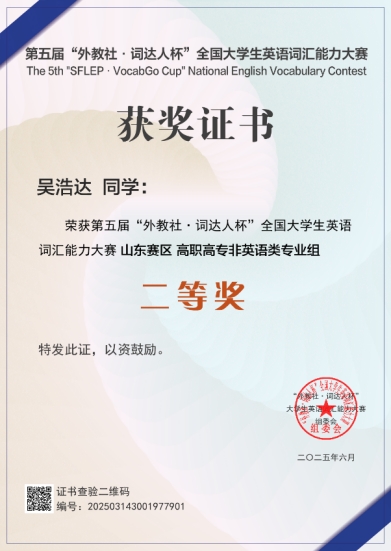近日,第五屆“外教社?詞達人杯”全國大學生英語詞匯能力大賽省賽獲獎名單揭曉。國凱航空學院學子憑借扎實的英語基礎(chǔ)與出色的競技表現(xiàn),在激烈的角逐中脫穎而出,2023級機場運行服務與管理專業(yè)吳浩達同學榮獲二等獎,2023級空中乘務專業(yè)許儀春同學榮獲三等獎。