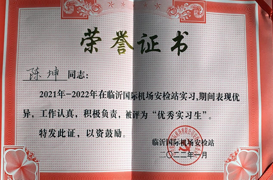 近日,國凱航空學院學子陳坤接過了臨沂啟陽國際機場領導親自頒發(fā)的“優(yōu)秀實習生”證書,以肯定他在實習期間付出的辛勤勞動和取得的優(yōu)異成績。
