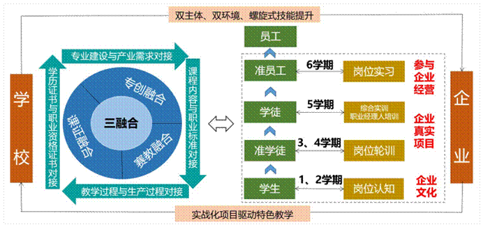 推動產(chǎn)教融合,構(gòu)建“雙主體、三融合、四對接、五遞進(jìn)”人才培養(yǎng)模式。與濰百集團(tuán)共建“山化院-濰百集團(tuán)”數(shù)智商貿(mào)產(chǎn)業(yè)學(xué)院,充分發(fā)揮校企雙主體、雙環(huán)境作用,通過校企專創(chuàng)、賽教、課證“三融合”,實現(xiàn)專業(yè)建設(shè)與產(chǎn)業(yè)需求、課程內(nèi)容與職業(yè)標(biāo)準(zhǔn)、教學(xué)過程與生產(chǎn)過程、學(xué)歷證書與職業(yè)資格證書“四對接”,五階段遞進(jìn)式培育,實現(xiàn)學(xué)生螺旋式技能提升。