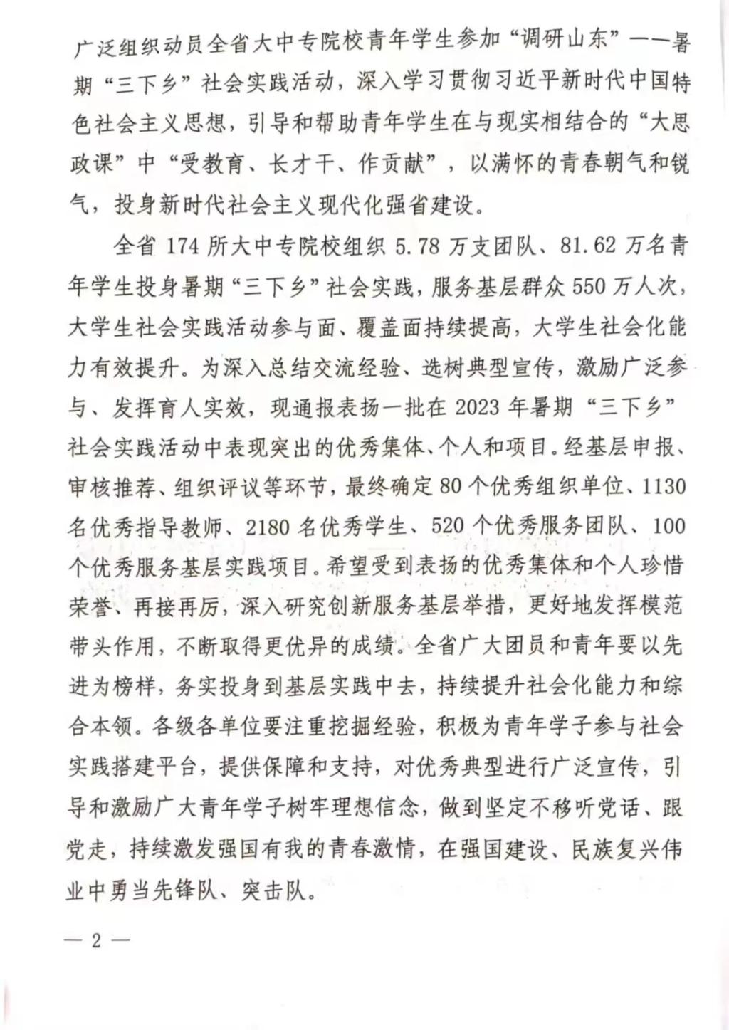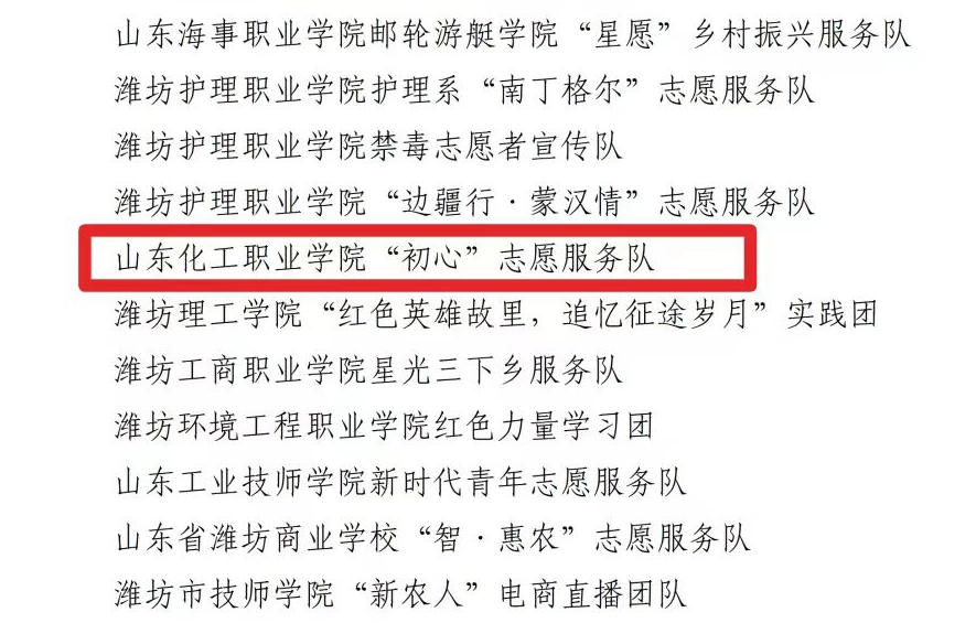 近日,共青團(tuán)山東省委公布《關(guān)于“調(diào)研山東”——2023年山東省大中專學(xué)生志愿者暑期“三下鄉(xiāng)”社會(huì)實(shí)踐活動(dòng)的通報(bào)》,我校榮獲多項(xiàng)表彰。學(xué)校榮獲2023年山東省大學(xué)生“三下鄉(xiāng)”社會(huì)實(shí)踐“優(yōu)秀組織單位”,學(xué)生梁永輝、楊欣坦、張夢(mèng)迪獲評(píng)“優(yōu)秀學(xué)生”,朱懷紅、王曉曄獲評(píng)“優(yōu)秀指導(dǎo)教師”,山東化工職業(yè)學(xué)院“初心”志愿服務(wù)隊(duì)獲評(píng)“優(yōu)秀服務(wù)團(tuán)隊(duì)”。