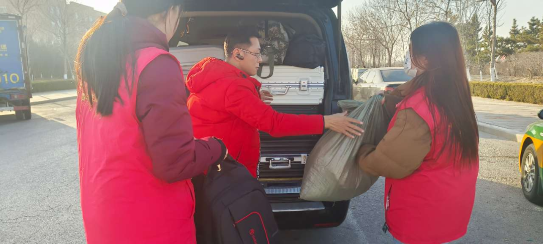 志愿者們不顧嚴(yán)寒天氣,按時(shí)到崗,與同學(xué)們面對(duì)面交流,積極主動(dòng)地為同學(xué)們搬運(yùn)行李,用實(shí)際行動(dòng)踐行為同學(xué)辦實(shí)事的初心和使命,紅色馬甲成為了校園里一抹動(dòng)人的色彩。