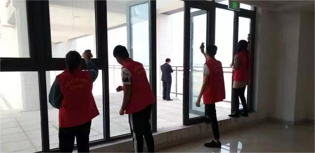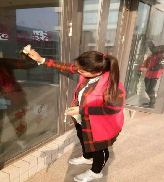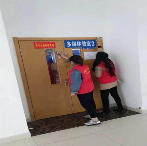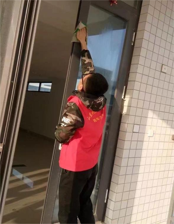 活動(dòng)中,青年志愿者們集中對(duì)校內(nèi)教學(xué)樓以及辦公樓的公共門窗進(jìn)行了清潔。
