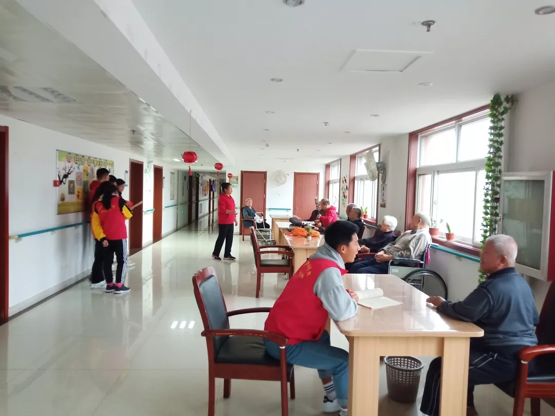 在經(jīng)過(guò)老師的培訓(xùn)后,我們有的進(jìn)入房間陪老人聊天,有的在房間外的活動(dòng)區(qū)域給老人唱歌講故事。一首《母親》引起了老人們的共鳴,老人們情不自禁的拍著手跟著哼起來(lái)……