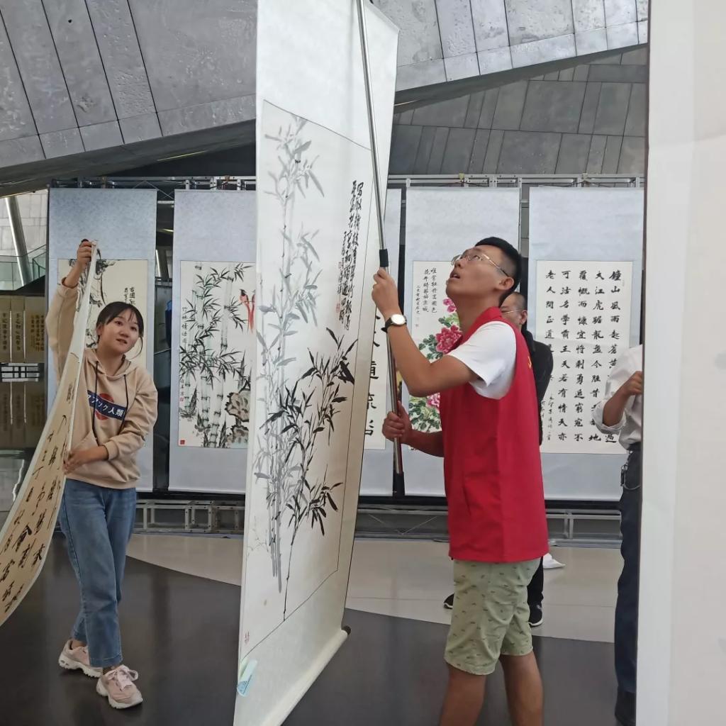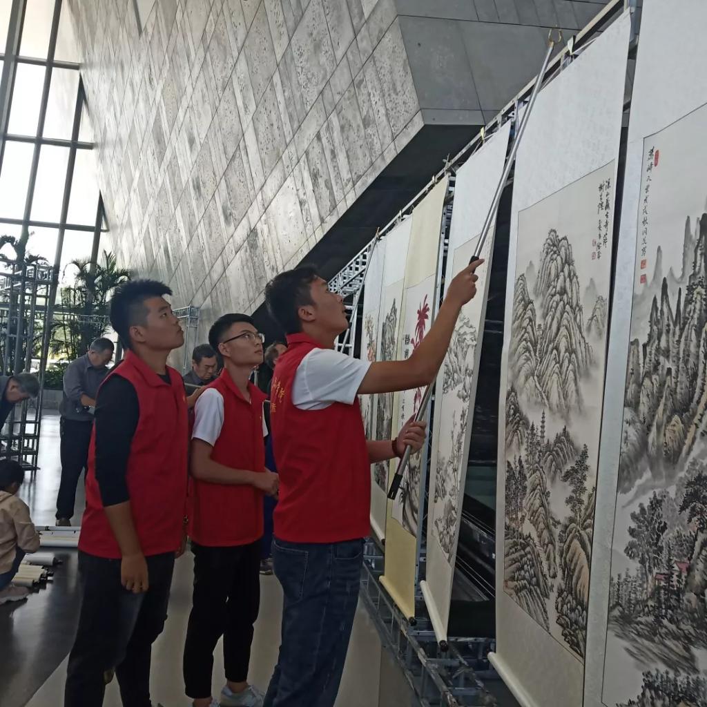 我院志愿者于9月22日前往城市藝術(shù)中心提前為書畫展布置現(xiàn)場。搬運(yùn)、整理、布置,我院志愿者用一上午時間將來自濰坊多個地區(qū)的書畫作品一一布置好。