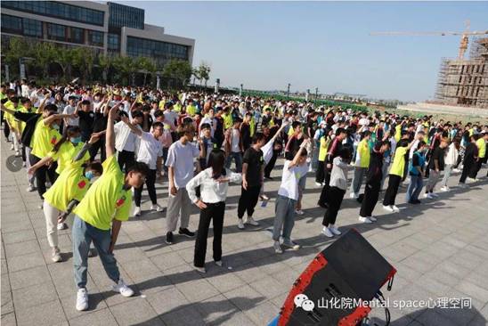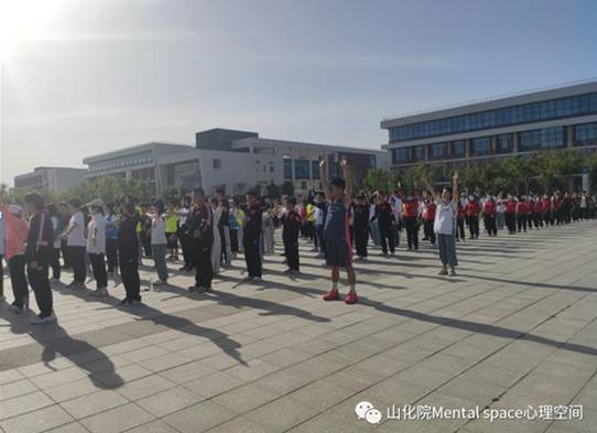 然后,由心理社團4名女生與籃球社4名男生合作,帶領(lǐng)全體師生進行熱身舞蹈運動。