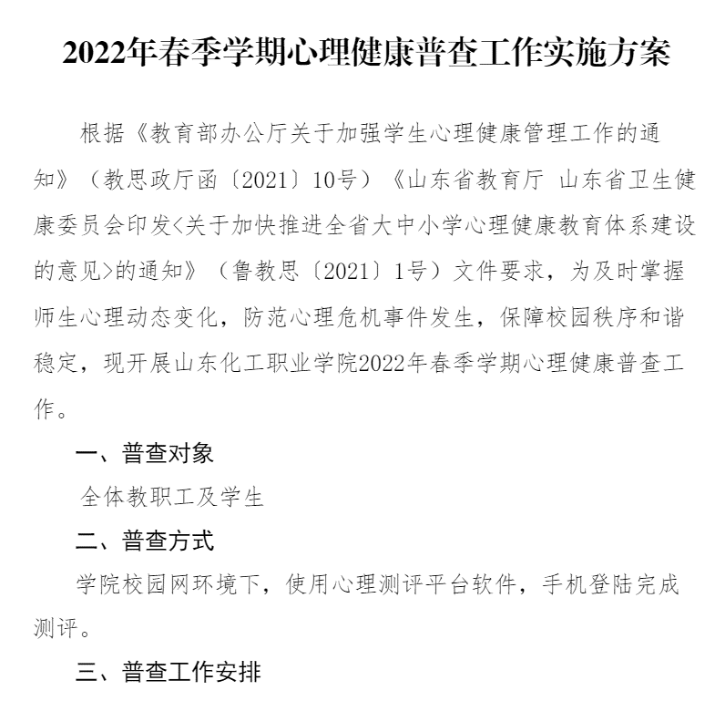 春季新學(xué)期開始,根據(jù)《教育部辦公廳關(guān)于加強(qiáng)學(xué)生心理健康管理工作的通知》(教思政廳函〔2021〕10號)《山東省教育廳 山東省衛(wèi)生健康委員會(huì)印發(fā)<關(guān)于加快推進(jìn)全省大中小學(xué)心理健康教育體系建設(shè)的意見>的通知》(魯教思〔2021〕1號)文件要求,為及時(shí)掌握師生心理動(dòng)態(tài)變化,防范心理危機(jī)事件發(fā)生,保障校園秩序和諧穩(wěn)定,于開學(xué)第一周開展山東化工職業(yè)學(xué)院2022年春季學(xué)期全體師生心理健康普查工作。