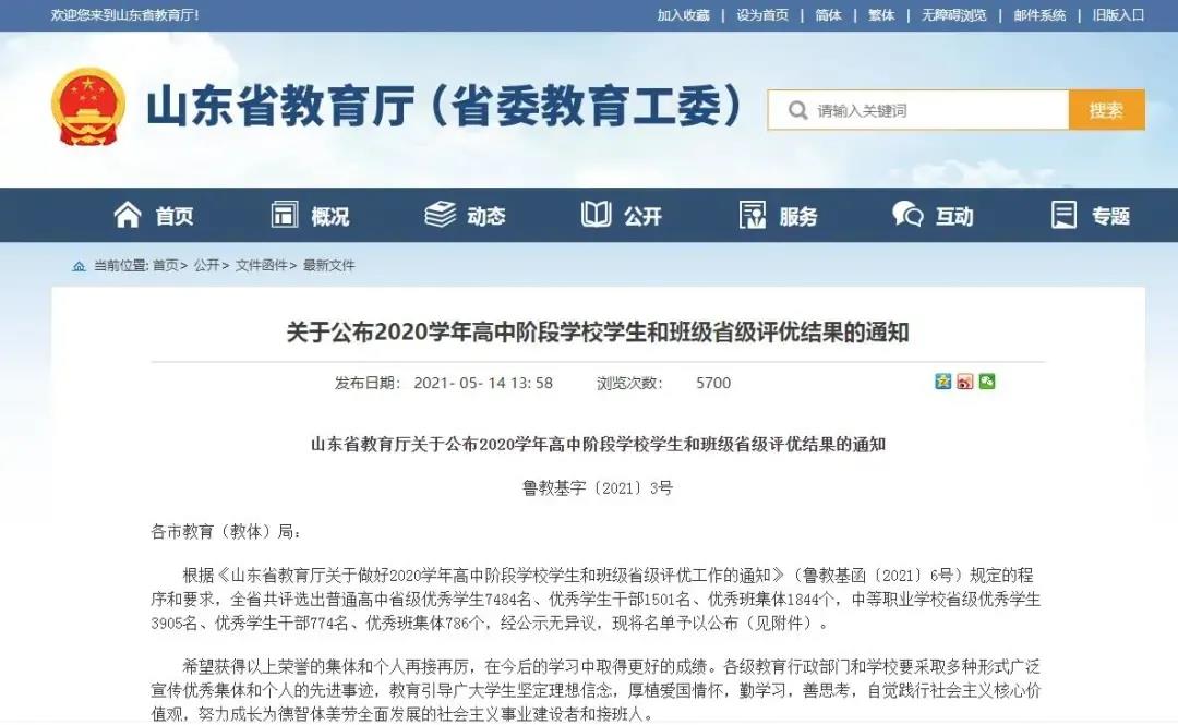 近日,山東省教育廳發(fā)布《關(guān)于公布2020學(xué)年高中階段學(xué)校學(xué)生和班級省級評優(yōu)結(jié)果的通知》,我院學(xué)生成績優(yōu)異,共有54人次(個(gè)人及集體)獲獎(jiǎng)。