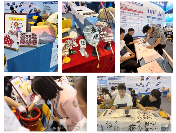 為做好職教好品主題展覽,書畫社團提前準備,用剪紙、書法、漆印、油畫等藝術形式表達自己的熱情。5名成員代表在活動現(xiàn)場為展現(xiàn)非遺文化的魅力,設置了漆扇制作區(qū)與書法體驗區(qū)。漆扇制作與毛筆書畫相融合,繪制出一把把與眾不同的扇子,深受觀展朋友們的喜愛,截止活動結(jié)束,共訂制售出漆扇120把。而在書法體驗區(qū),體驗者們紛紛拿起毛筆,在宣紙上留下自己的墨寶,通過各類形式表現(xiàn)對傳統(tǒng)文化的熱愛和敬意。